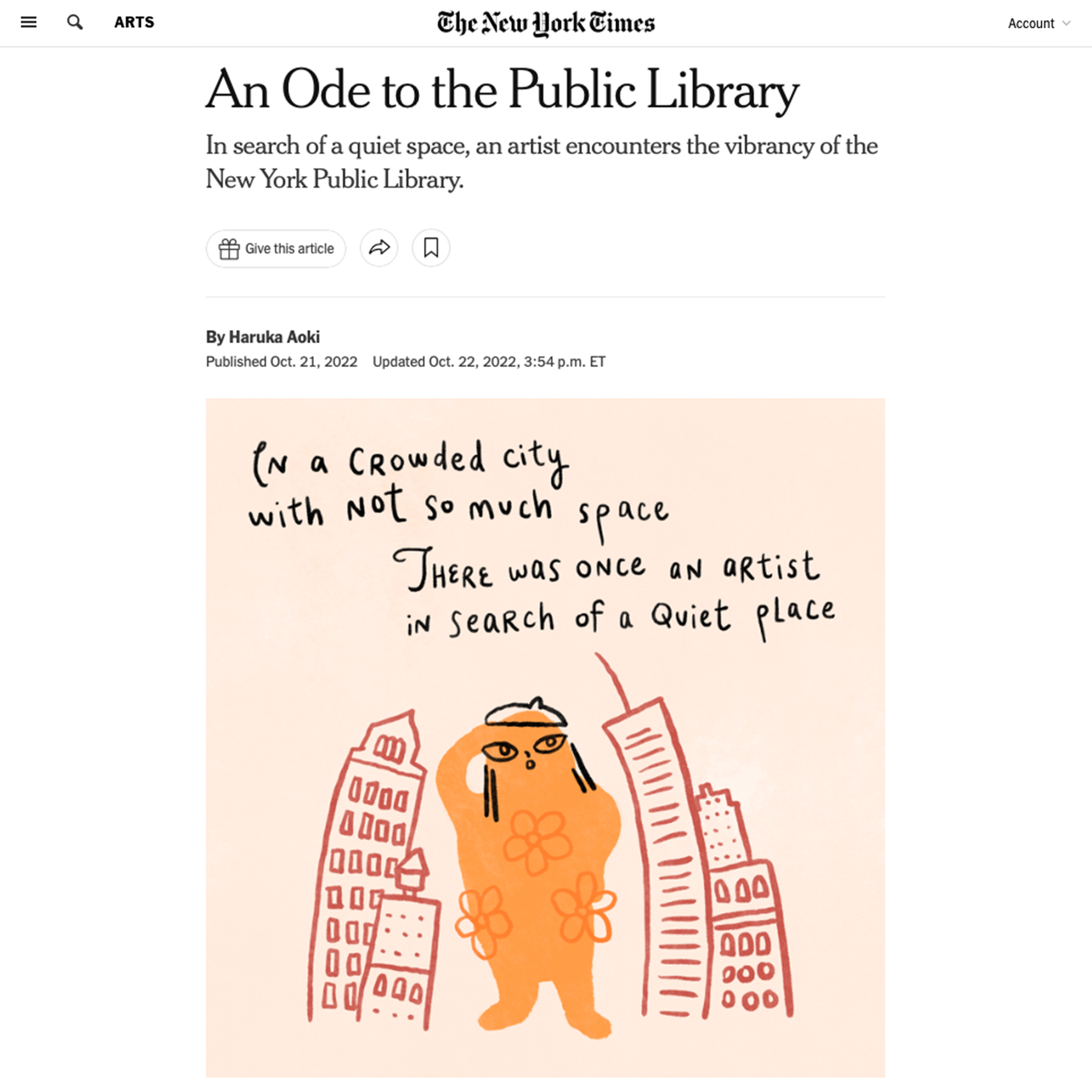 I wrote and illustrated a poem inspired by a recent "rediscovery" of the library in my thirties. Published online and in the September 25, 2022 print issue of The New York Times, Sunday Arts & Leisure section.